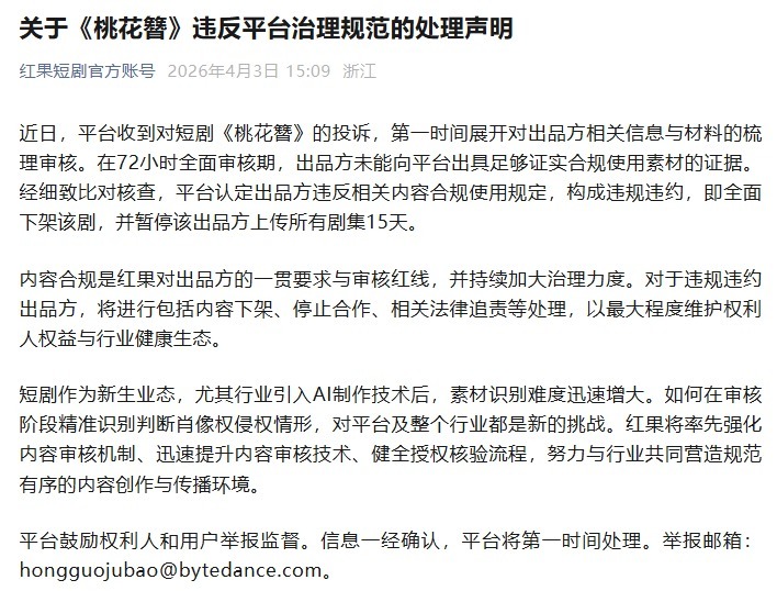 4月3日,红果短剧官方账号发布声明:近日,平台收到对短剧《桃花簪》的投诉,第一时间展开对出品方相关信息与材料的梳理审核。在72小时全面审核期,出品方未能向平台出具足够证实合规使用素材的证据。经细致比对核查,平台认定出品方违反相关内容合规使用规定,构成违规违约,即全面下架该剧,并暂停该出品方上传所有剧集15天。